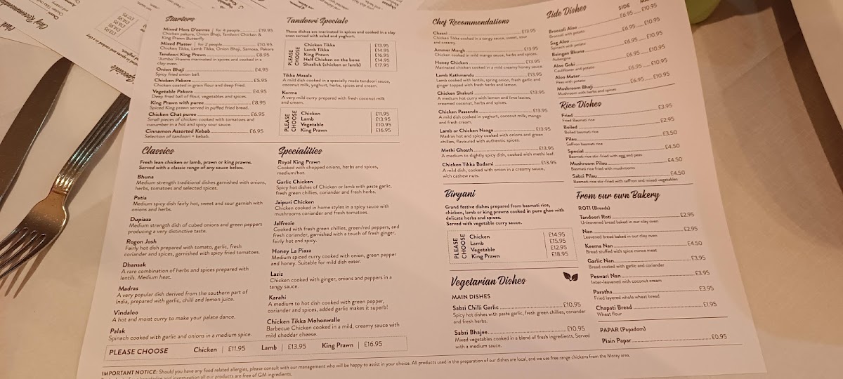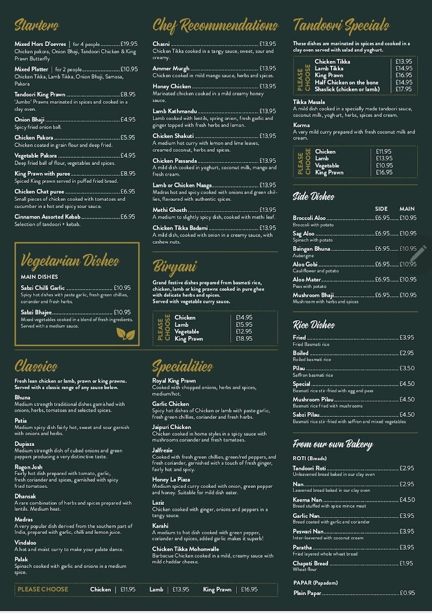 Begin your meal with delectable Starters like the King Prawn With Puree or the crispy Onion Bhaji. For a heartier experience, the chef's recommendations, including Chicken Tikka Badami and Chicken Passanda, are sure to impress. Diners appreciate the generous servings and the cozy ambiance, making it perfect for gatherings.